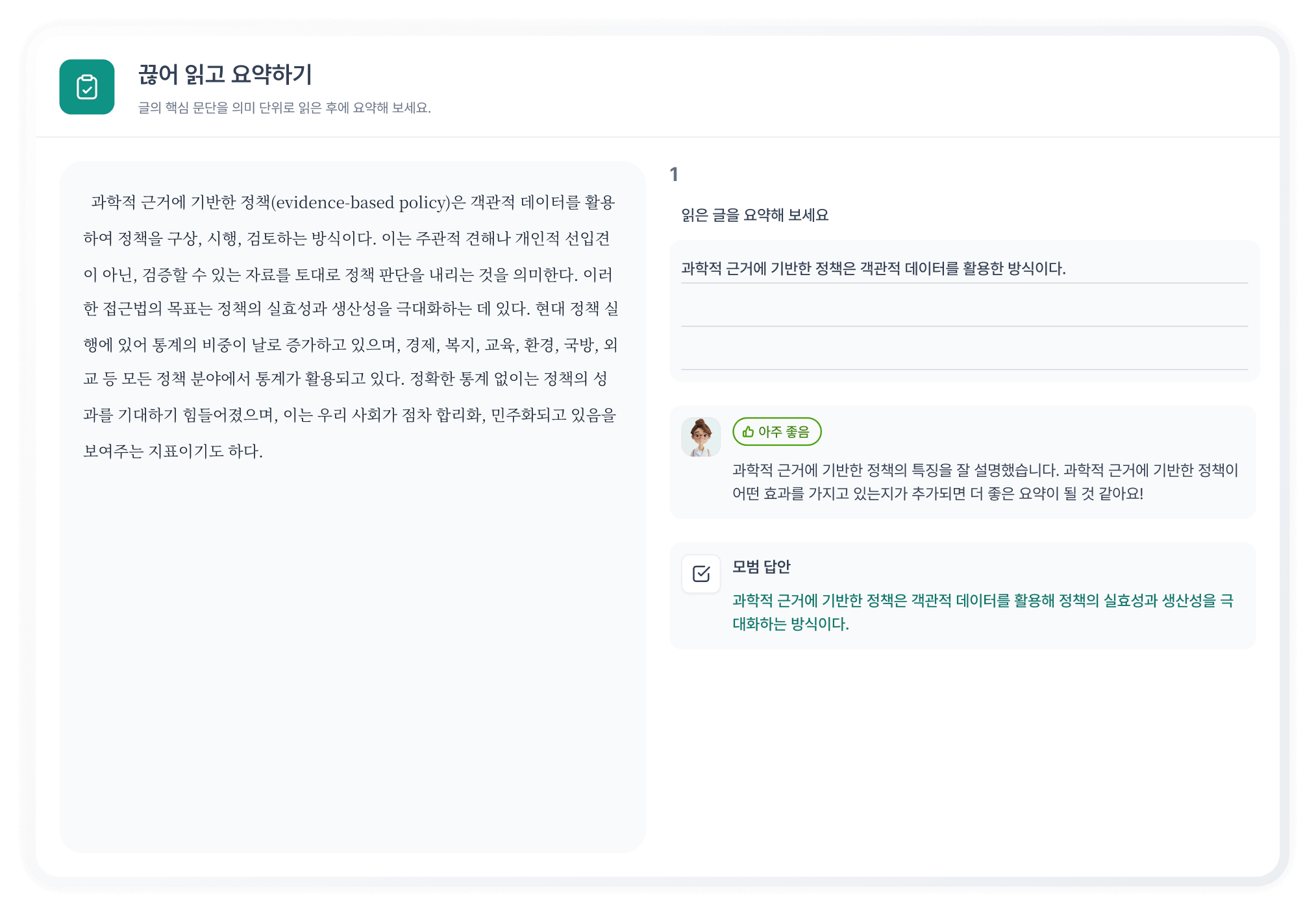 글의 전체 구조를 직접 채워보는 단계별 학습이에요.