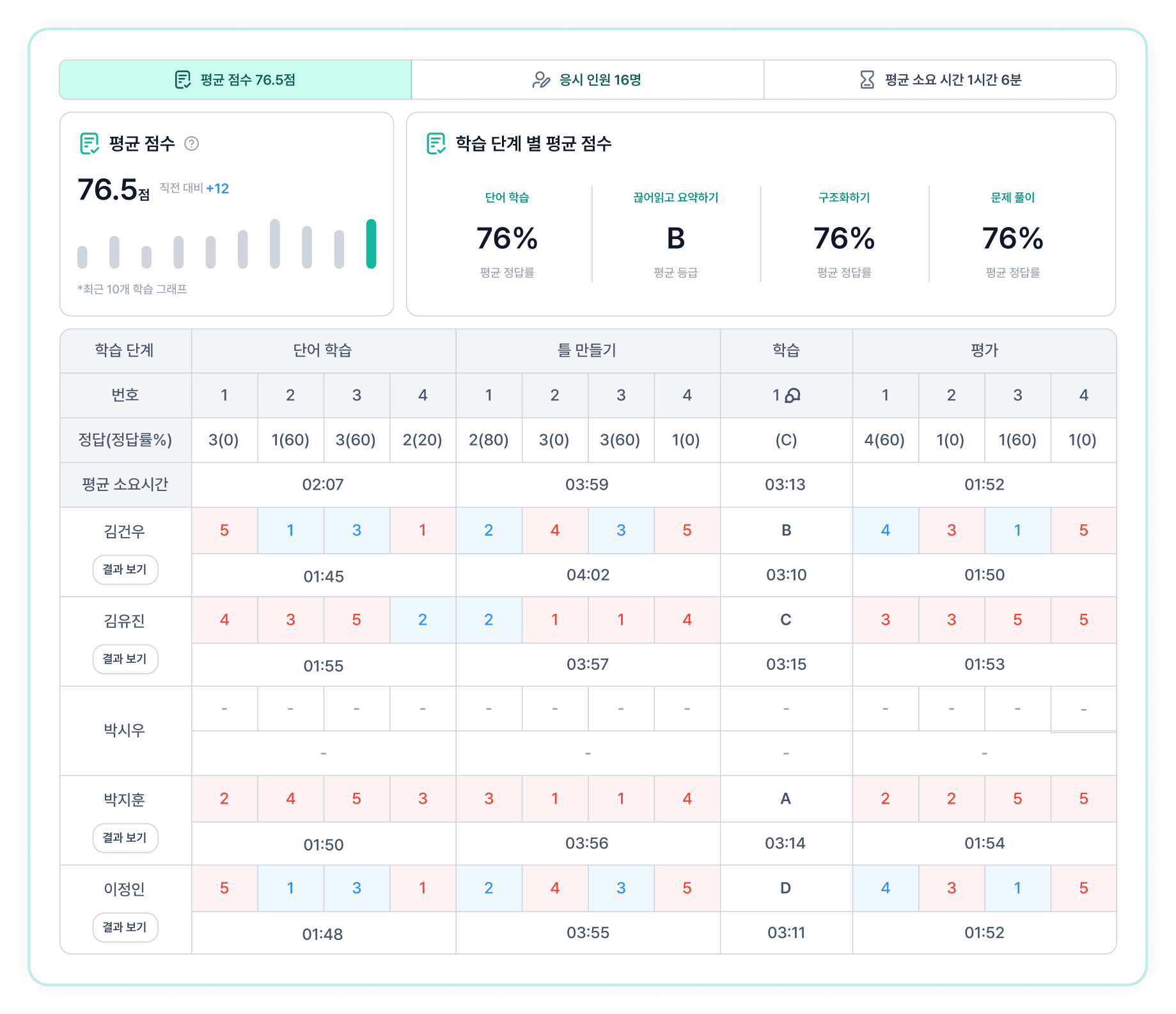 정오표에서 학생별 정답 여부를 한눈에 확인하고, 리포트에서 평균 점수·소요 시간·참여도 변화를 추적해요.