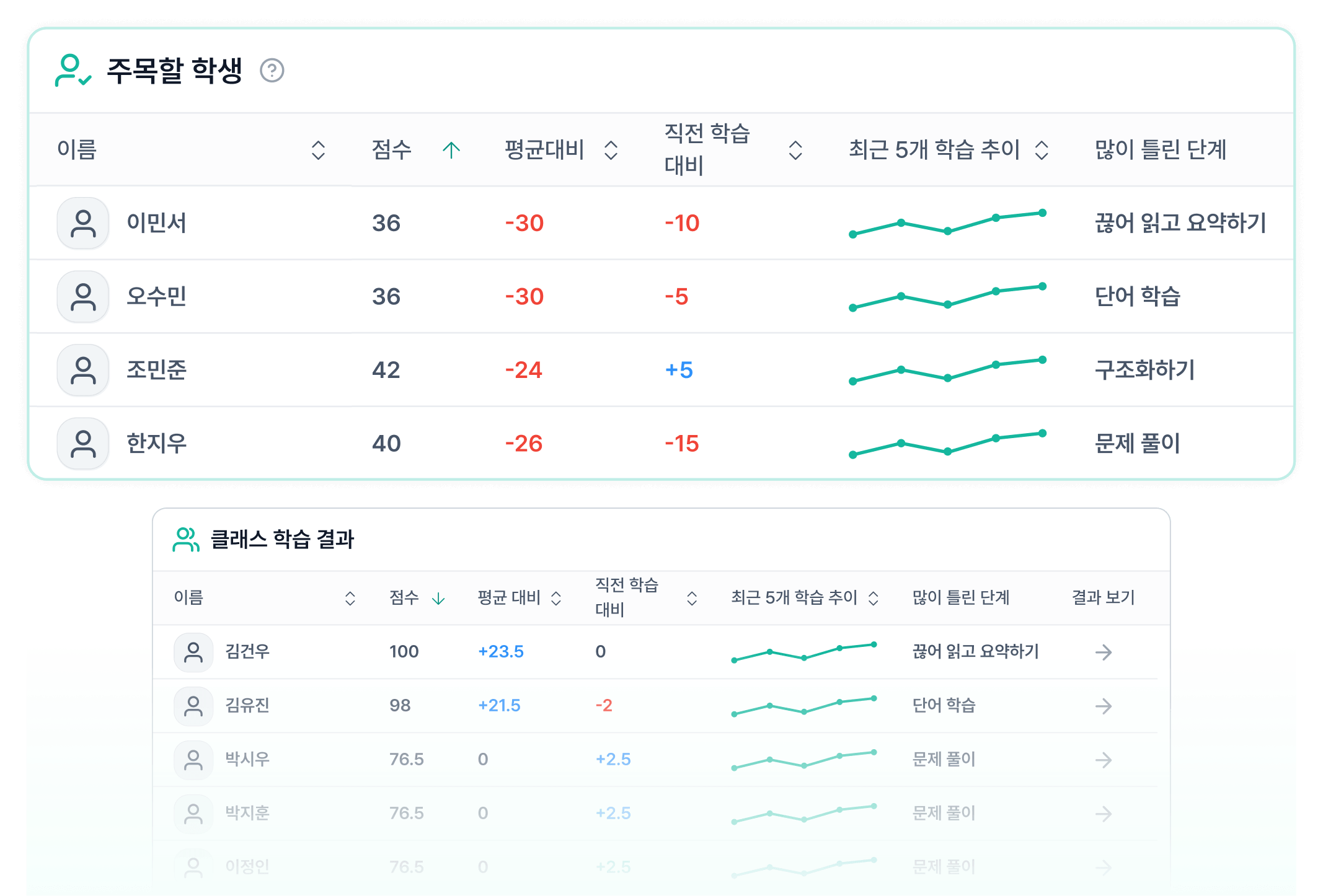 점수가 떨어진 아이, 학습을 안 한 아이는 '주목할 학생'으로 표시되어 빠짐없이 챙길 수 있어요.