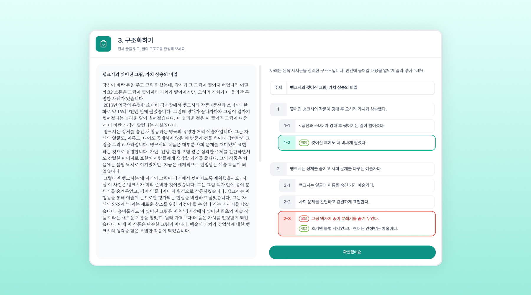 네, 확실히 있었어요. 1학기 대비 2학기에 정답률이 눈에 띄게 올라갔거든요. 특히 인상 깊었던 건 '구조화하기' 문제 유형이에요. 문단의 핵심 내용을 파악하고 구조를 잡는 건데, 아이들이 반복적으로 풀다 보니 자연스럽게 체득하더라고요. "문단이 뭐예요?"라고 묻던 아이들이 나중엔 알아서 핵심 문장을 찾아내고 있으니까, 교사 입장에서 되게 뿌듯했죠.